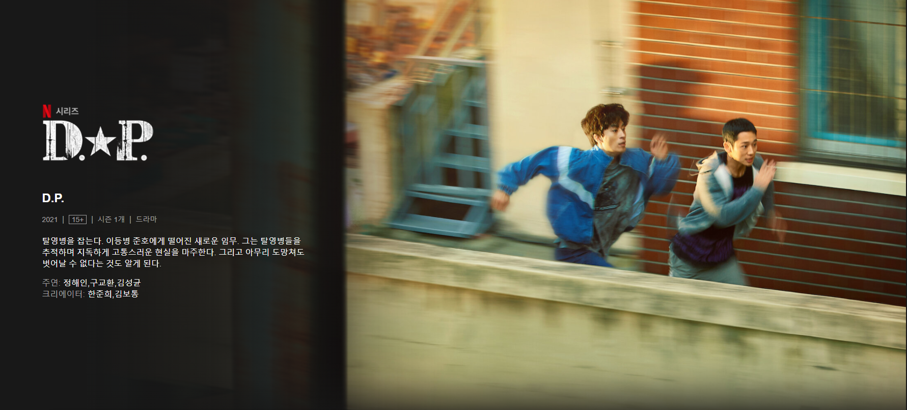 줄거리: 탈영병들을 잡는 군무 이탈 체포조(D.P.) 준호와 호열이 다양한 사연을 가진 이들을 쫓으며 미처 알지 못했던 현실을 마주하는 이야기를 다룬 드라마